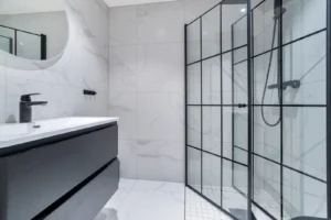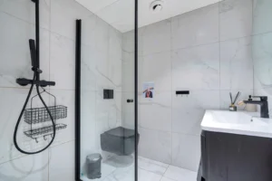 Moderne med dusj, toalett og servant