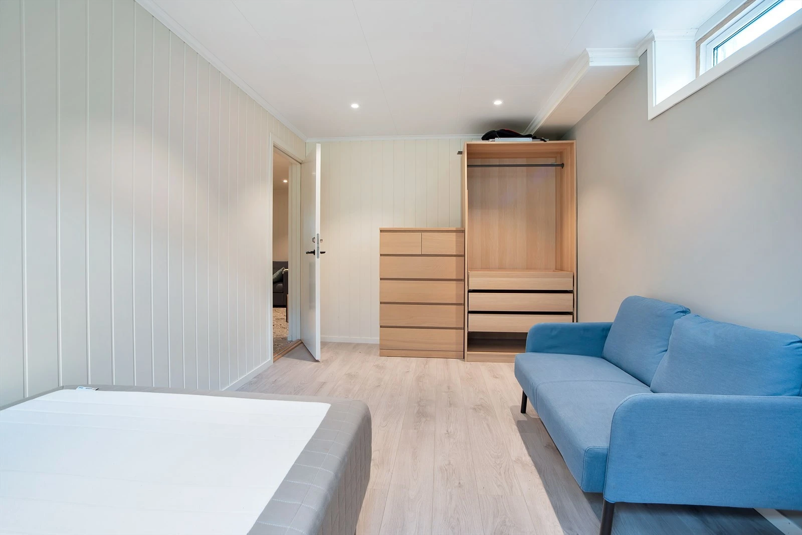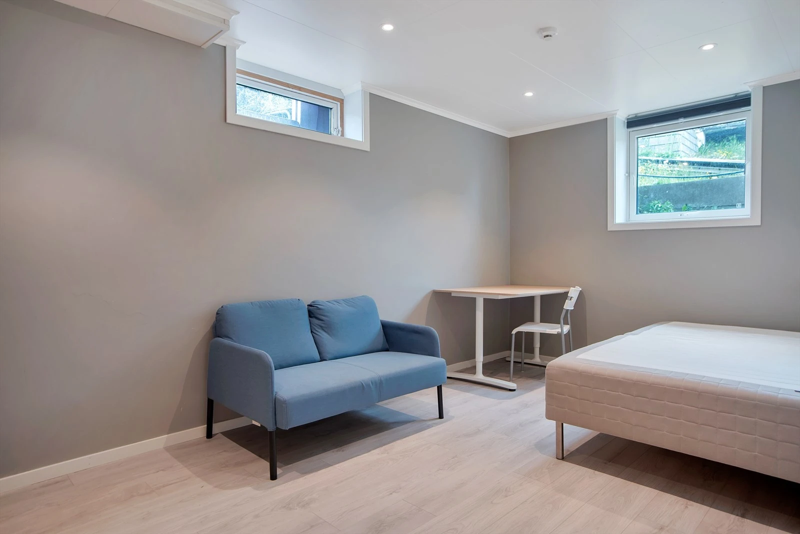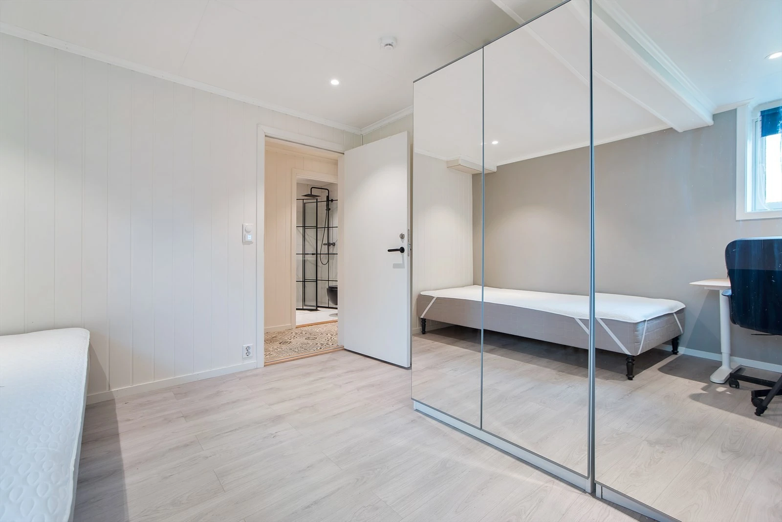 Romslig med plass til seng, skrivebord og garderobe