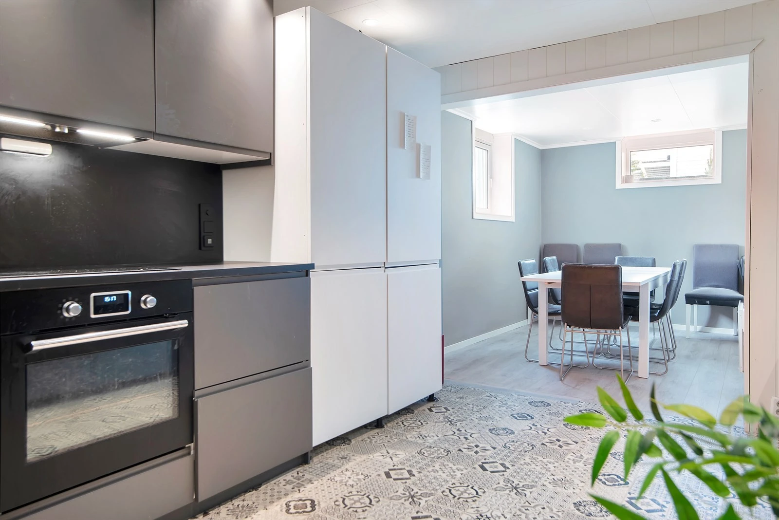 Kjøkkenet er fullt utstyrt med alle nødvendige hvitevarer, inkludert komfyr, kjøleskap, oppvaskmaskin og mikrobølgeovn. Den tilstøtende spisestuen har plass til at alle beboere kan spise sammen.