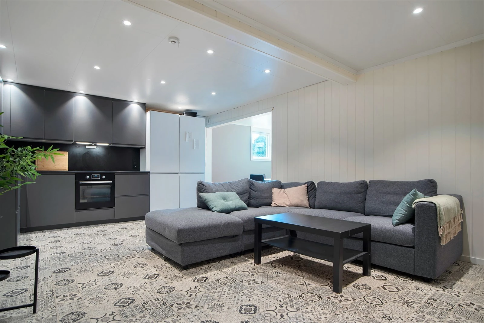 Stuen er leilighetens sosiale hjerte, med god plass til sofa, TV og andre møbler. Dette er et perfekt sted for avslapping, filmkvelder eller sosiale sammenkomster med venner.